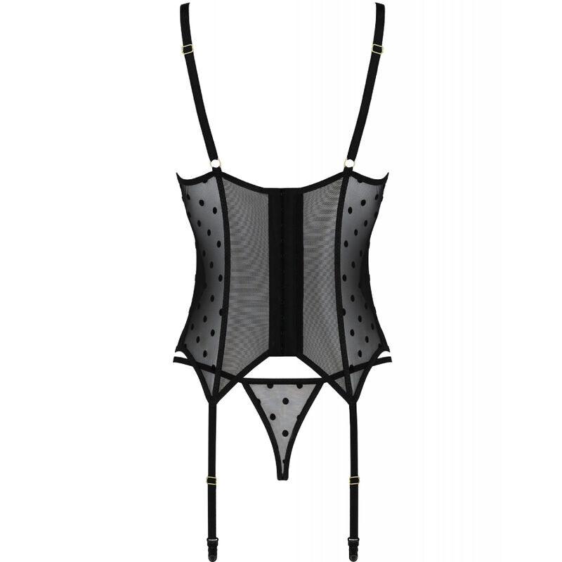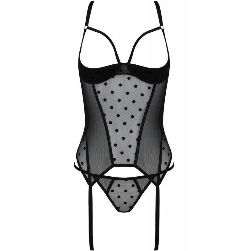 Lo spettacolare corsetto Marina è una combinazione di tulle trasparente con una stampa a pois molto raffinata. La parte superiore del corsetto è costituita da coppe aperte. Il seno è sostenuto grazie all'utilizzo di ferretti e rinforzi. Il set comprende un bellissimo perizoma.