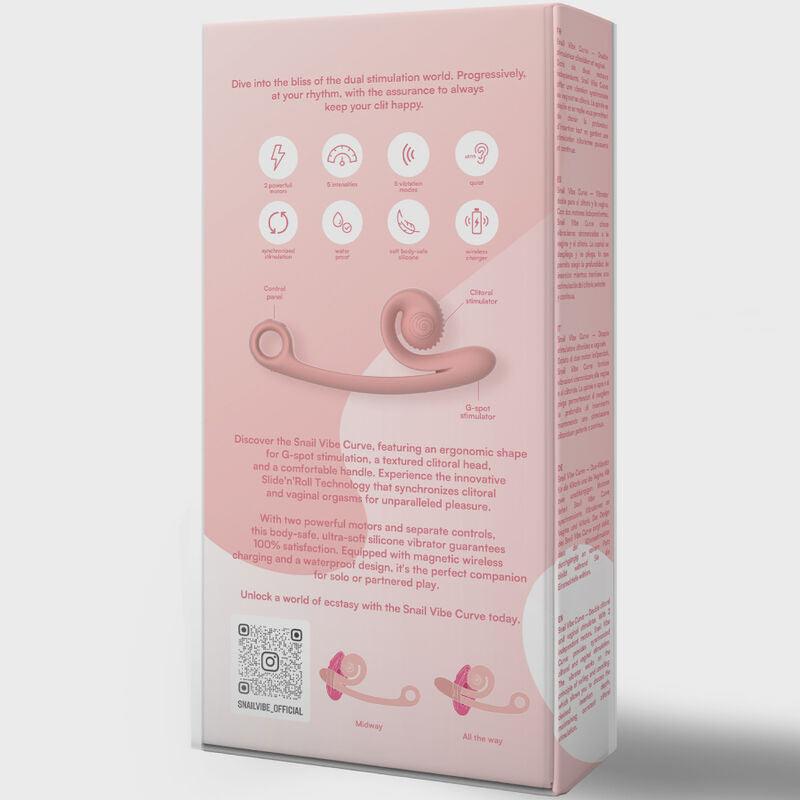 Scopri la Snail Vibe Curve, caratterizzata da una forma ergonomica per la stimolazione del punto G, una testa clitoridea testurizzata e una comoda impugnatura. Prova l'innovativa tecnologia Slide'n'Roll che sincronizza i orgasmi clitoridei e vaginali per un piacere senza pari.