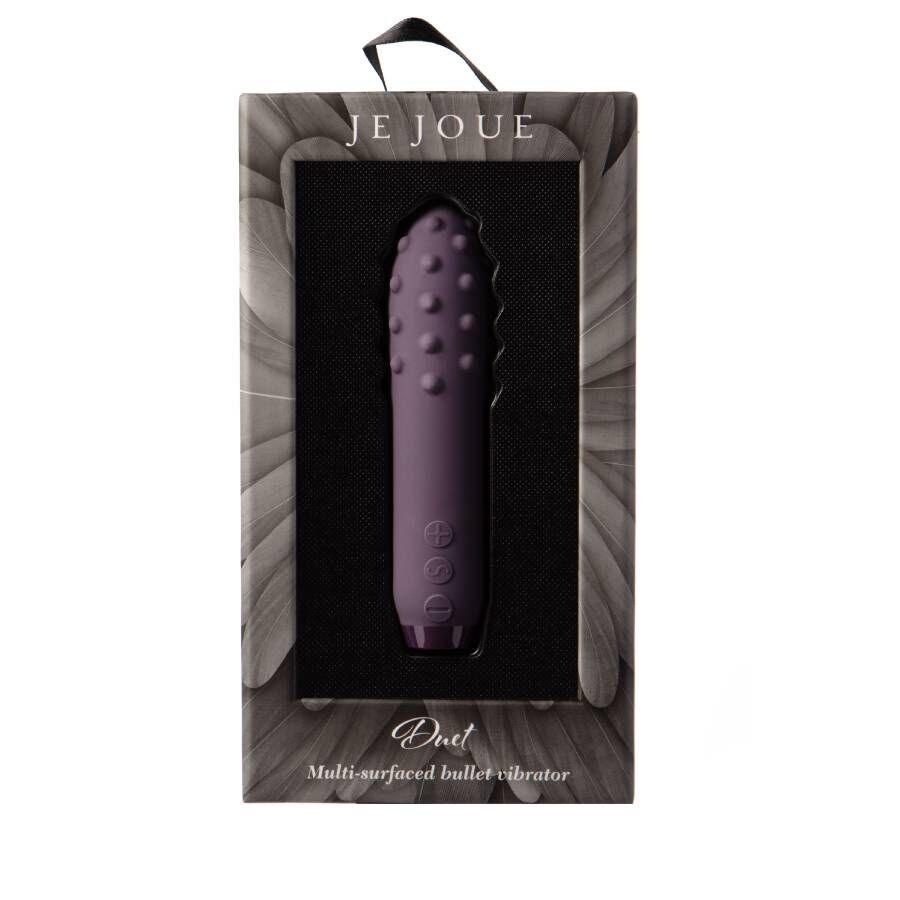 Ti presentiamo Duet, un vibratore bullet multisuperficie con piccoli punti di piacere arrotondati e graduati da un lato e una superficie liscia come la seta dall'altro per donare molteplici sensazioni in tutto il corpo. Usa Duet per stimolare i punti di piacere esterni come il clitoride, i capezzoli e la coscia. E se vuoi esplorare ulteriormente, Duet è il partner perfetto per giochi di penetrazione delicati e superficiali con le sue vibrazioni profondamente ricche. Con il suo silicone di grado medico, morbido come la seta e sicuro per il corpo, Duet è piacevole al tatto e ancora migliore da provare. Lascia che i famosi motori rumorosi di Je Joue coccolino il tuo corpo più profondamente, regalandoti un'esperienza intima più ricca e piacevole.