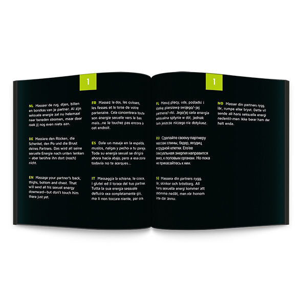 Le 24 sfide dell'edizione Foreplay sono disponibili in 10 lingue: inglese, spagnolo, francese, tedesco, olandese, polacco, russo, italiano, svedese e norvegese e ti porteranno senza dubbio a un climax mai sperimentato prima. Sei abbastanza cattivo da fare il grande passo? Lasciatevi sorprendere, emozionare e attrarre e, soprattutto, prendetevi il tempo per godervi l'un l'altro. Divertiti!