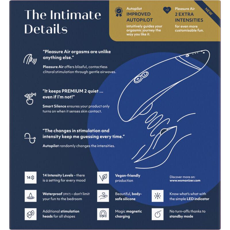 Il Womanizer Premium 2 ha amplificato il suo gioco con più livelli di intensità che mai e una funzione di pilota automatico migliorata per accompagnarti nella corsa della tua vita. Con l'originale tecnologia Pleasure Air, questo è il giocattolo definitivo per le donne che cercano qualcosa di più di un semplice dispositivo con cui giocare.