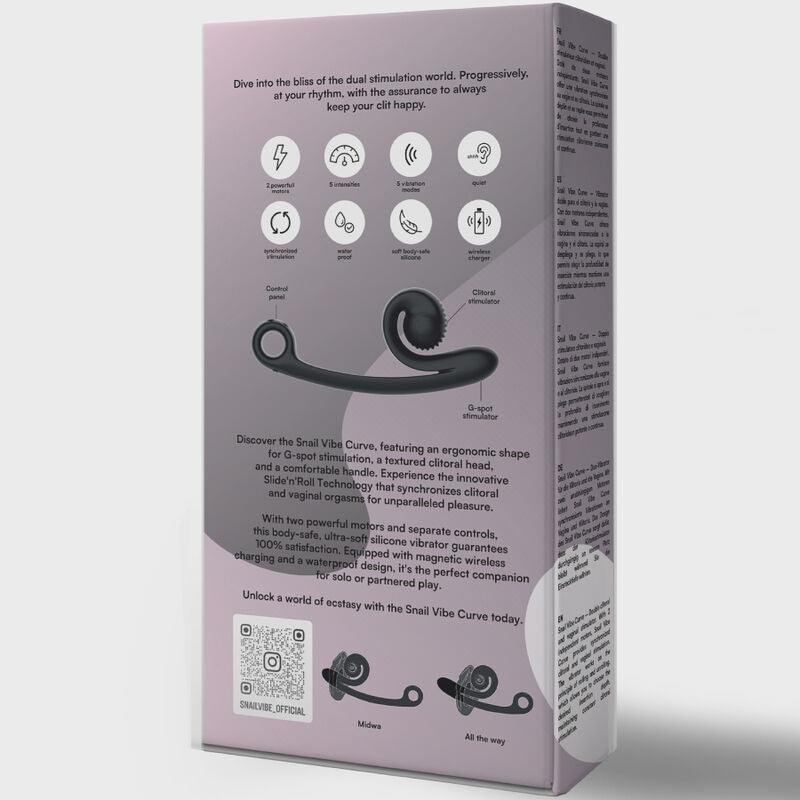 Scopri la Snail Vibe Curve, caratterizzata da una forma ergonomica per la stimolazione del punto G, una testa clitoridea testurizzata e una comoda impugnatura. Prova l'innovativa tecnologia Slide'n'Roll che sincronizza i orgasmi clitoridei e vaginali per un piacere senza pari.