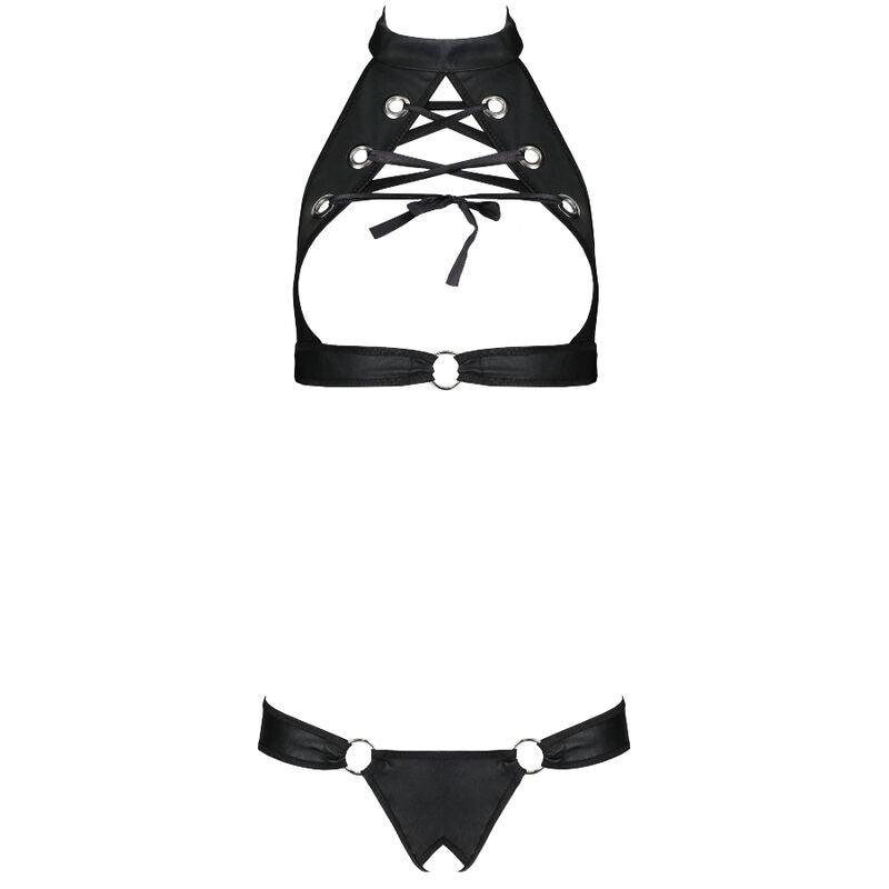 Malwia è un completo composto da un top in pelle fissato al collo con anelli e lacci decorativi, che sottolinea e valorizza il busto e il perizoma con un affascinante ritaglio. I giunti decorativi a forma di cerchi donano un fascino particolare.